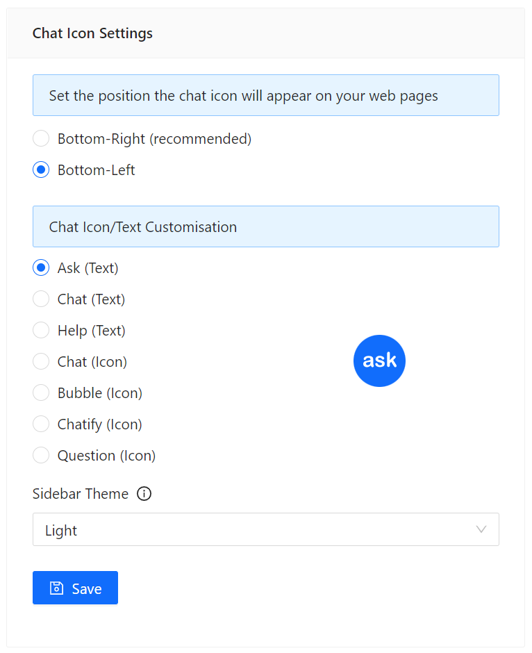 You can change the position, and icon/text of the Live Chat sidebar on the "Chat Icon Settings" panel