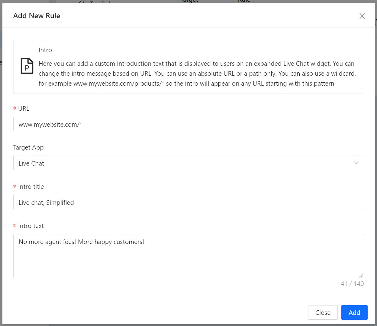 URL: You can define a full URL such as www.chatify.com/live-chat or you can define a path /live-chat you can also use a wildcard, for example to apply the greeting to all of your website can specify /*