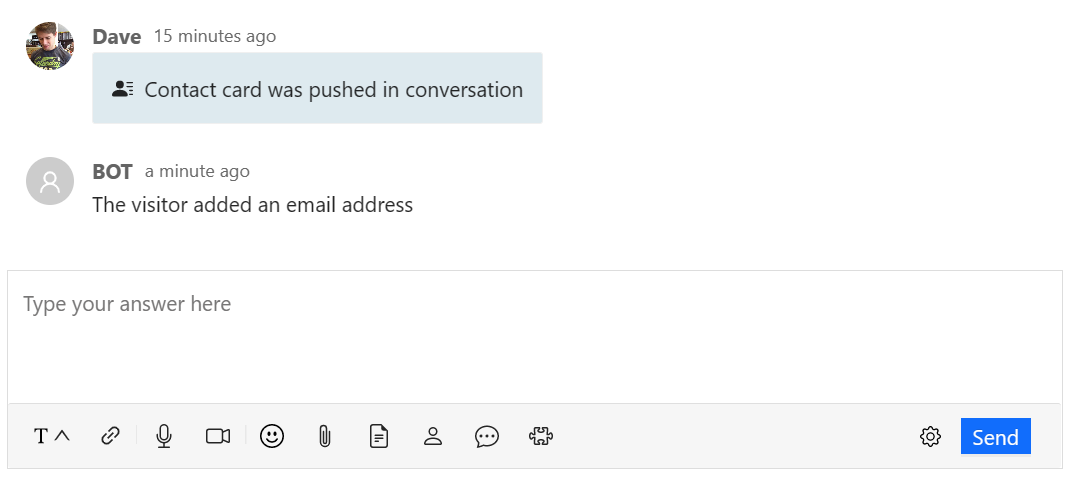 If the visitor skipped inputting their contact details but you later require to capture them, you can prompt them to input by pushing a contact card into the conversation.
